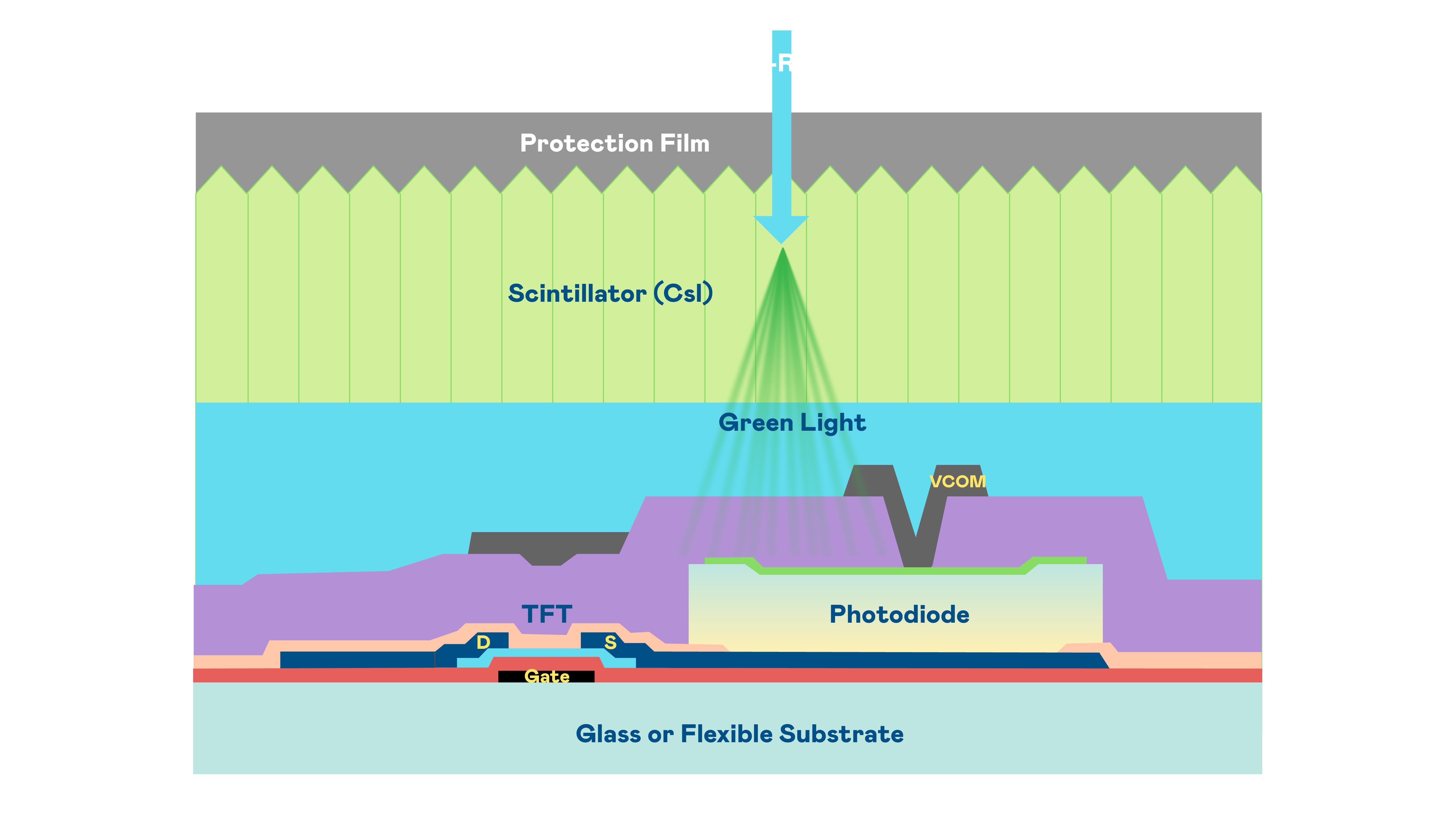 hth·华体的X光影像感测阵列使用薄膜电晶体 (TFT) 作为每个像素的读取开关,搭配光电二极体(Photodiode)的光电转换元件,用以感测X光影像讯号。
