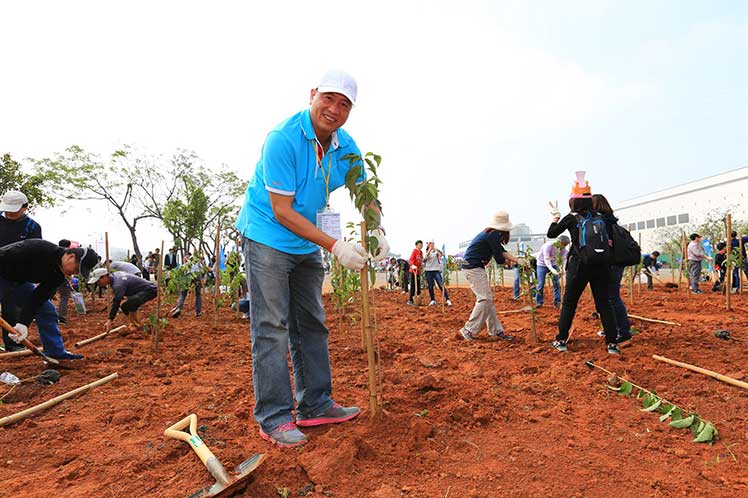 友達光電不斷落實環境永續的理念與承諾,今年是第十屆與明基友達基金會共同合辦「Green Party 綠色嘉年華」植樹活動。舉辦活動十年來,友達與集團企業已於全球廠區累計種植超過 100 萬棵樹,約莫一年可吸收 1.8 萬噸的二氧化碳排放量,相當於 2,500 座標準足球場面積的森林每年的吸碳量。友達今年仍持續以具體行動實踐對環境的綠色承諾,號召達運、隆達、友達晶材等集團公司近兩千名員工和眷屬擔任植樹志工,親手種下山櫻花、馬纓丹及長穗木等樹種,期望藉由別具意義的植樹活動,喚起社會正視節能減碳的重要性。